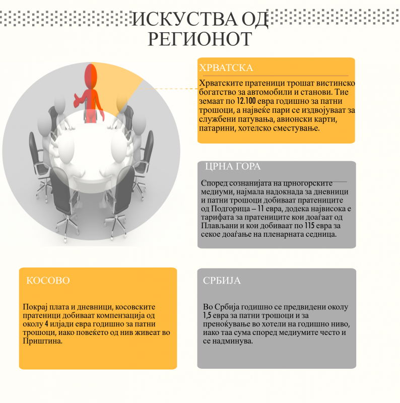 Стотици евра секојдневно издвојуваат парламентите на Република Србија, Хрватска, Црна Гора и на Косово за секој пратеник што ќе го запали сопственото возило за да дојде на пленарна седница. Најголеми трошачи се српските пратеници, иако по издатоците за бензин и за хотелско сместување рекорди водат и другите земји од регионот, меѓу кои е и Македонија.