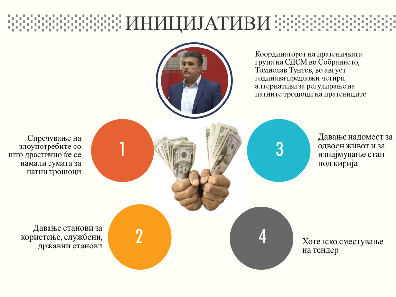 Координаторот на пратеничката група на СДСМ во Собранието, Томислав Тунтев, во август годинава предложи четири алтернативи за регулирање на патните трошоци на пратениците. Ваквиот предлог произлезе кога токму Тунтев беше цел на критиките дека за три месеци зел 2.588 евра за патни трошоци до родниот град Охрид.