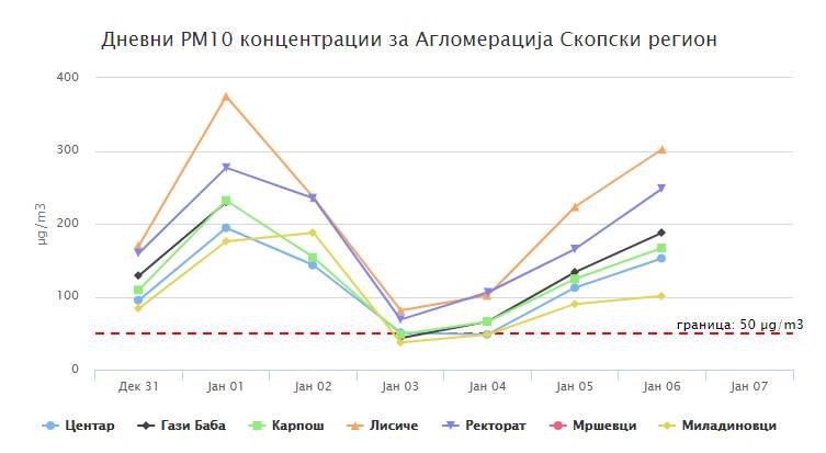 Скопскиот аларм за загадувањето вечерва повторно се вклучи. Граѓаните на социјалните мрежи ги споделуваат последните мерења на квалитетот на воздухот во главниот град и концентрацијата на штетните ПМ10 и ПМ2.5 честички и бараат одговор зошто не се преземаат мерки против труењето.