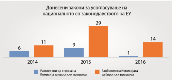 Собранието усвојувало повеќе „европски закони“ заобиколувајќи ја целата процедура предвидена за законите со европско знаменце во периодот 2014-2016. Во годишниот извештај за работата на Собранието во 2016 година пишува дека Законодавниот дом донел вкупно 14 закони кои произлегуваат од Национална програма за усвојување на правото на Европската Унија и претставуваат усогласување со правото на ЕУ. Симптоматично е што 13 закони воопшто не се разгледувани на седница на Комисија за европски прашања, за нив нема европско знаменце, нема изјава за усогласеност ниту коресподентна табела, иако се прикажани како „европски“ закони.