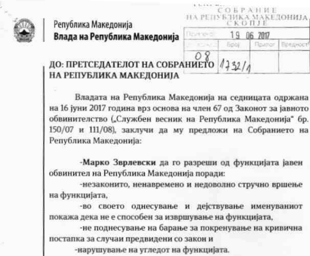 Предлогот Зврлевски да биде разрешен од функцијата јавен обвинител е поднесен од Владата поради, како што се наведува во дописот од Собранието, незаконито, ненавремено и недоволно стручно вршење на функцијата. Исто така, во документот се наведува и дека Зврлевски со своето однесување и дејствување покажал дека не е способен за извршување на функцијата, како и поради тоа што не поднел барање за покренување кривична постапка за случаи предвидени со закон и нарушување на угледот на функцијата.