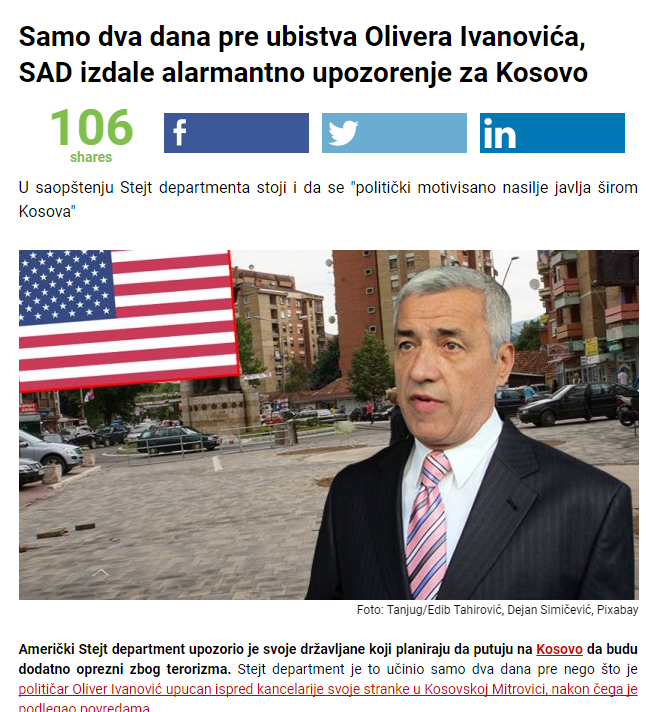 Српски медиуми: Два дена пред убиството на Ивановиќ, САД издадоа алармантно предупредување за Косово