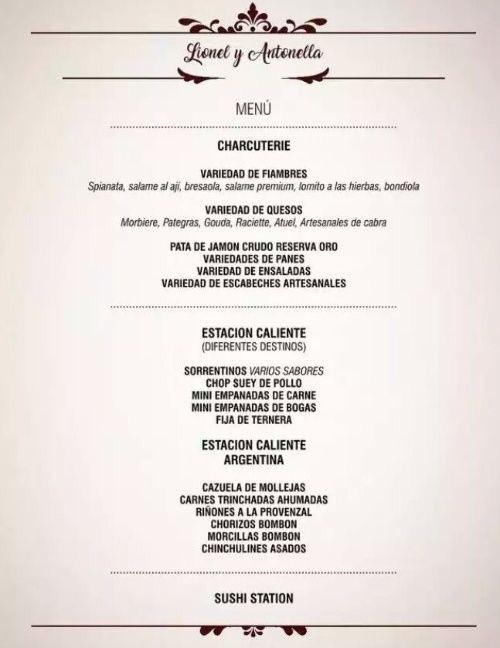 Деликатест од повеќе видови на месо , различни сирења, салати, пршути , суши и други делиции се најдоа на свадбеното мени на фудбалската ѕвезда Лео Меси кој на 30 јули ќе се венча со долгогодишна девојка, Антонела Рокусо.