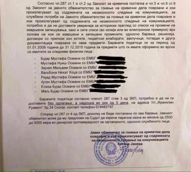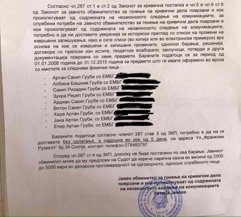 Документот, кој е потпишан од обвинителката Елизабета Јосифовска, содржи барање за податоци за имотот на Бујар Османи и неговото семејство за периодот 2008-20015 година, а другото барање, на кој има краток нечиток потпис, се однесува за имотот на Артан Груби за истиот период.