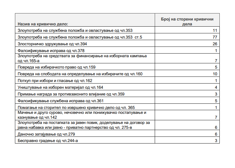 За последните шест месеци тимот на Катица Јнавеа поднесе 18 обвиненија за 19 предмети против 120 лица за 168 кривични дела, напиша специјалната јавна обвинителка во извештајот за работата на СЈО. Во текот на извештајниот период отворени се 7 нови истражни постапки против 25 физички и преземени се истражни дејства за 4 правни лица. Јанева пишува дека е особено важно мислењето на Апелациониот суд од Скопје за бомбите како доказ во судската постапка. Oд Судот во прв степен не е определена ниту една од побараните мерки притвор, пишува Јанева. Најмногу кривични дела се за злоупотреба на службената положба и овластување, дури 77, и злосторничко здружување – 26.