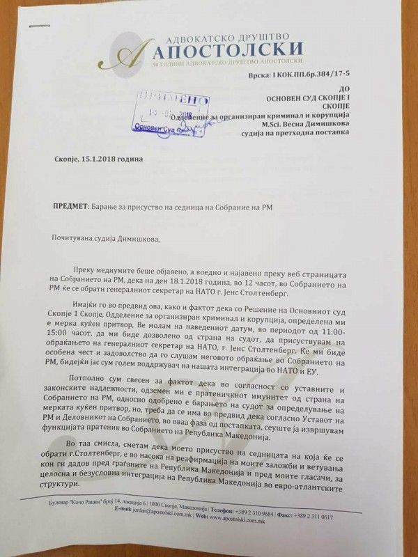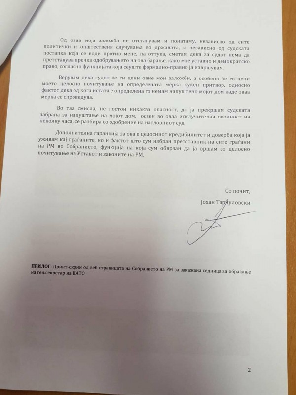 Според дописот, Тарчуловски наведува дека неговото присуство на седницата е во насока на неговите заложби и ветувања пред граѓаните за целосна интеграција на Македонија во евро-атлантските структури. „Почитувана судија Димишкова, преку медиумите беше објавено, а воедно и најавено преку веб-страницата на Собранието, дека на 18 јануари во 12 часот во парламентот ќе се обрати генералниот секретар на НАТО, Јенс Столтенберг. Имајќи го предвид ова, како и фактот дека со решение на Основниот суд Скопје 1, одделение за организиран криминал и корупција, определена ми е мерка куќен притвор, Ве молам во периодот од 11 до 15 часот да ми биде дозволено од страна на судот да присуствувам на обраќањето на Столтенберг. Ќе ми биде особена чест и задоволство да го слушам неговото обраќање во Собранието бидејќи сум голем поддржувач на нашата интеграција во НАТО и ЕУ“, се вели во барањето.