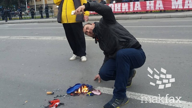 Во моментот кога Љубиша Настовски, претседател на МОС од импровизираната бина во паркот „Жена – борец“ го одјавуваше протестот, група млади луѓе кои тој ги нарекуваше јунаци на булеварот „11 Октомври“ го запалија знамето на ЕУ.