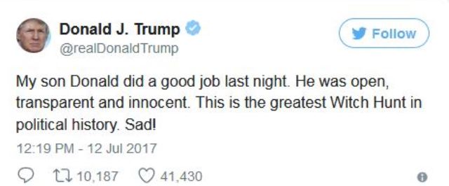 „Мојот син Доналд синоќа ја направи вистинската работа. Беше отворен, транспарентен. Ова е најголемиот лов на вештерки во политичката историја. Тажно“, напишал американскиот претседател на Твитер.