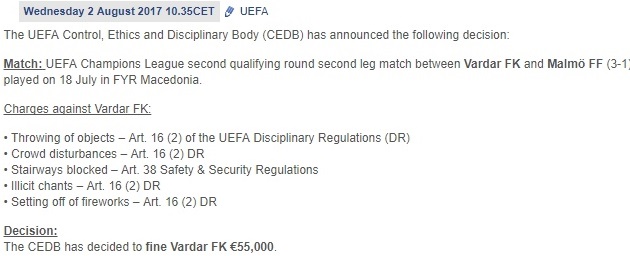 Вардар е казнет поради фрлање предмети на теренот, неспортското однесување на навивачите како и поради користење на пиротехника. н.ц