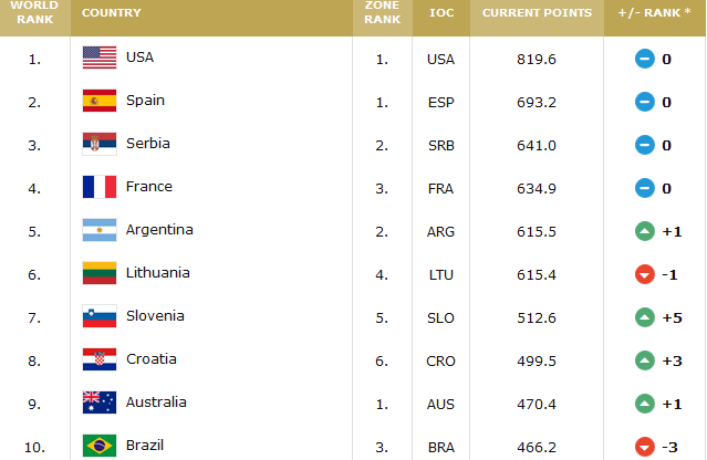 На врвот на ФИБА листата се САД пред Шпанија, Србија, Франција и Аргентина, додека новиот европски шампион Словенија е на седмото место. н.ц.