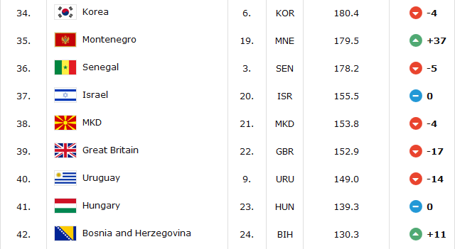 Инаку најголем скок на листата напаравија европските селекции Холандија од 38 места и сега се наоѓа на 46.место, потоа Црна Гора и Ислан кои напредуваа за 37 позиции и Естонија која „скокна“ за 35 места.