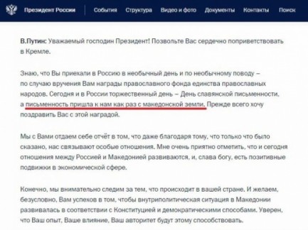 Денеска во Русија е свечен ден – Денот на словенската писменост, а писменоста дојде кај нас токму од македонската земја. Сакам да ве поздравам со оваа награда “.