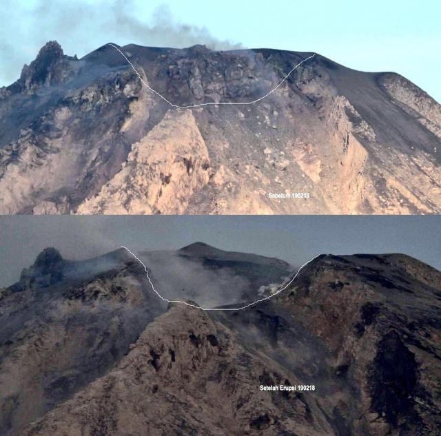 Сликите пред и по ерупцијата направени од Индонезискиот центар за вулканологија покажуваат дека од врвот на планината фали еден огромен дел. Во оваа најнова активност на вулканот нема повредени, а на видеата што се објавуваат се гледаат деца кои со викање бeгаат од своето училиште.