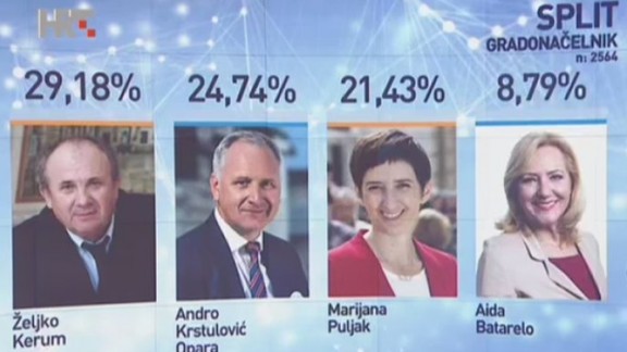 Во Сплит, најголем број на гласови доби контроверзниот бизнисмен и поранешен градоначалник Жељко Керум, 29,9 проценти од гласовите, а во вториот круг најверојатно противкандидат ќе му биде Андро Крстуловиќ Опара од Хрватската демократска заедница (ХДЗ), кој доби 25,4 отсто од гласовите.