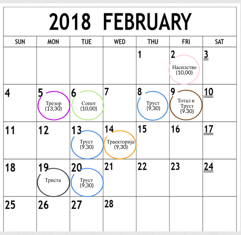 Случајот „Насилство“, во кој првообвинет е екслидерот на ВМРО-ДПМНЕ, Никола Груевски, е закажано за 2 февруари. Два дена подоцна, на 5 февруари почнува судењето за „Трезор“, предметот во кој обвинети се поранешниот директор на УБК, Сашо Мијалков, поранешниот началник на Петтата управа, Горан Грујевски, кој е во екстрадициски притвор, ексшефот на кабинетот на Мијалков, Тони Јакимовски и помошник-министерот во МВР и поранешен член на Управен одбор на Телеком, Небојша Стајковиќ, дека злоупотребиле државни пари за набавка на опрема во Петтата управа за лично богатење.