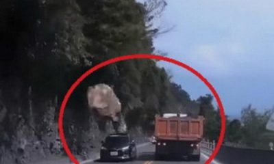 Неколку тајвански возачи имале многу среќа. На видеото може да се види како карпа, која паднала од голема височина на патот, за малку ги промашила автомобилите...