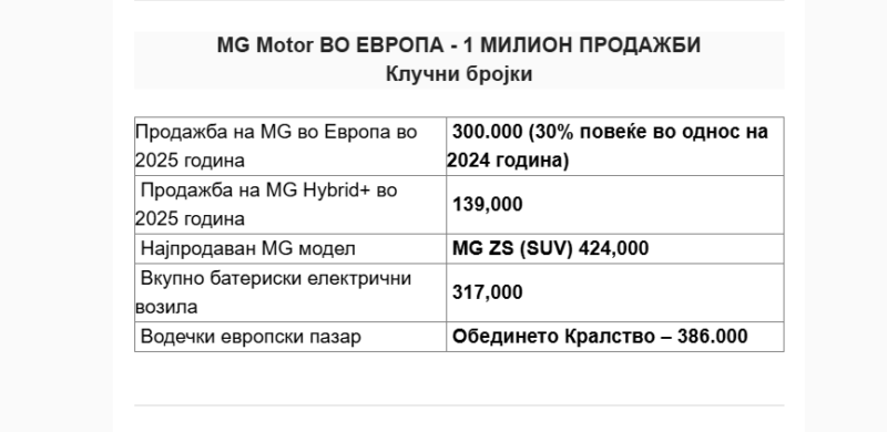 Клучен фактор зад подемот на MG Motor е способноста на брендот да понуди навистина достапни, стилски и возбудливи за возење електрични и напредни хибридни возила, достапни пред многу други брендови. Оригиналниот и високо пофален MG4 EV се покажа како значаен успех. До денес, MG Motor има испорачано 317.000 електрични возила во Европа и неодамна ги лансираше моделите 2026 MG4 EV и целосно новиот MG4 EV Urban.