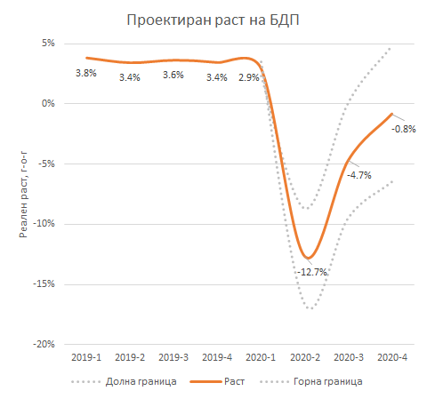 Врз основа на овие претпоставки, Фајнанс тинк проектира вкупен економски пад за 2020 година од -3.8%. Тој се очекува да достигне најголем интензитет во вториот квартал (-12.7%), а согласно на претпоставките, следните квартали да забележат економска консолидација. На следниот графикон се претставени проекциите за растот на БДП, заедно со интервалот на доверба, кој ја отсликува неизвесноста сврзана со погорните претпоставки.