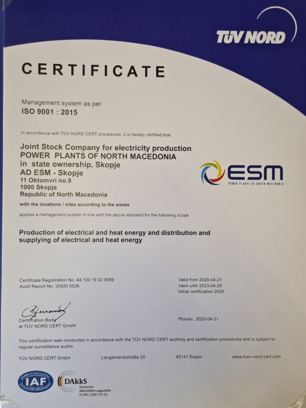 „АД ЕСМ положува големо значење на сертификатот ISO 9001:2015 со оглед на тоа што сертификатот обезбедува строго пропишан протокол за работење и потврдува дека компанијата работи по систем за менаџирање на квалитетот, кој е фокусиран на потребите на клиентите и е гарант за испорачување ниво на квалитет што е преземено како обврска“, се наведува во соопштението.