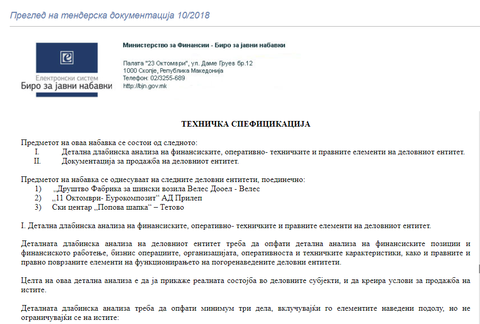 На Електронскиот систем за јавни набавки Владата објави оглас за консултантски услуги за продажба на 3 фирми во државна сопственост. Според тендерската документација што ја објави Генералниот секретаријат на Владата, станува збор за Фабриката за шински возила „Велес“, позната како „Колска“, прилепскиот загубар „11 Октомври – Еурокомпозит“ и ски-центарот „Попова Шапка“.