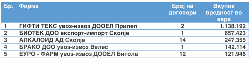Пет фирми со најголема вредност на договори поврзани со коронавирусот