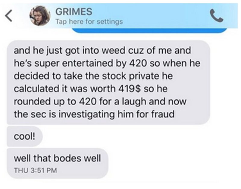 Американската раперка Азелија Банкс на својот инстаграм-профил објави во август размена на пораки меѓу неа и девојката на Елон Маск, пејачката Гримес, во кои пејачката вели дека Маск почнал да пуши трева поради неа и дека се заинтересирал за симболиката на бројот 420.