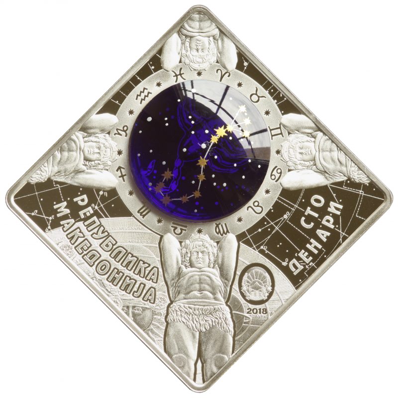 На аверсот, во централниот дел на монетата се прикажани четири атласа коишто го држат небото и круг со симболите на сите хороскопски знаци. На вметнато кобалтно стакленце е претставена слика на северното небо со ѕвездата Северница во центарот, опкружена со соѕвездието Стрелец. Во долниот дел е претставен цртеж на Сончевиот Систем. На основата е прикажан дел од небесната карта. Во долниот дел од аверсот се прикажани грбот на Република Македонија и годината на издавање на монетата – „2018“. Исто така, прикажани се и натписите на македонски јазик: „Република Македонија“ и „100 денари“.