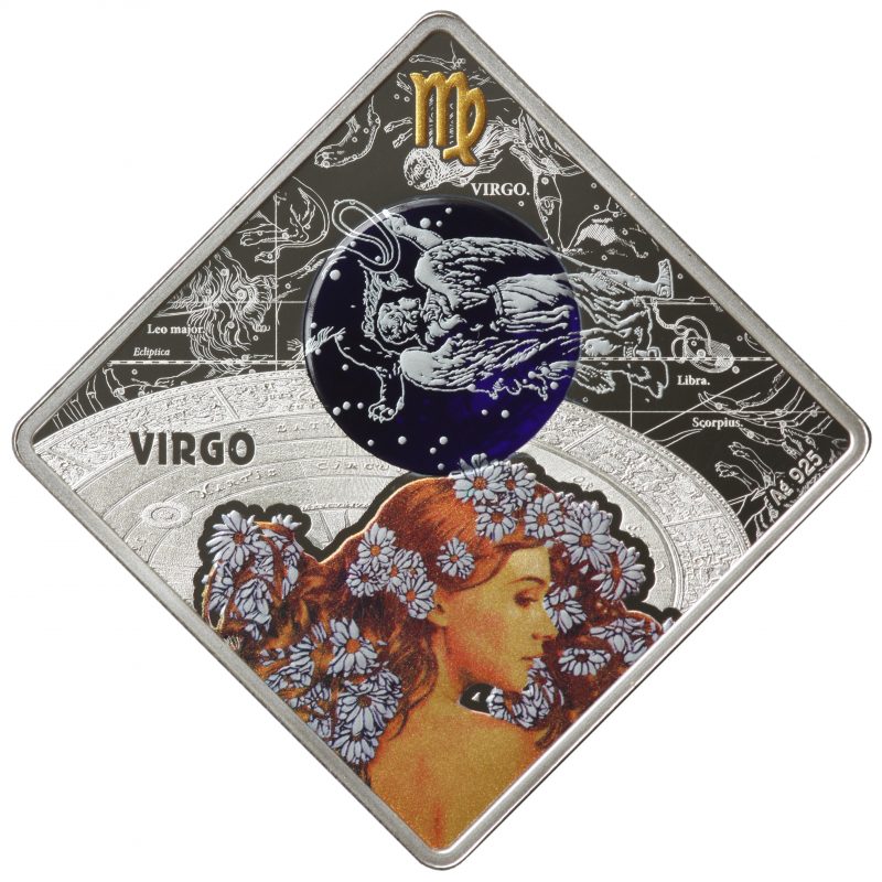 На реверсот, во горниот дел од монетата е претставена слика на девица од ѕвездениот атлас Firmamentum Sobiescianum создаден од Јоханес Хевелиј на крајот на 17 век. Сликата на хороскопскиот знак девица и неговото соѕвездие преминува и на вметнатото кобалтно стакленце. Во горниот дел од монетата е претставен симболот на хороскопскиот знак девица. Во долниот дел е претставена златна слика на жена, врз цртеж на кој е претставен Сончевиот Систем. На левата страна е прикажано латинското име на хороскопскиот знак – VIRGO, а на десната страна, ознаката Ag925.