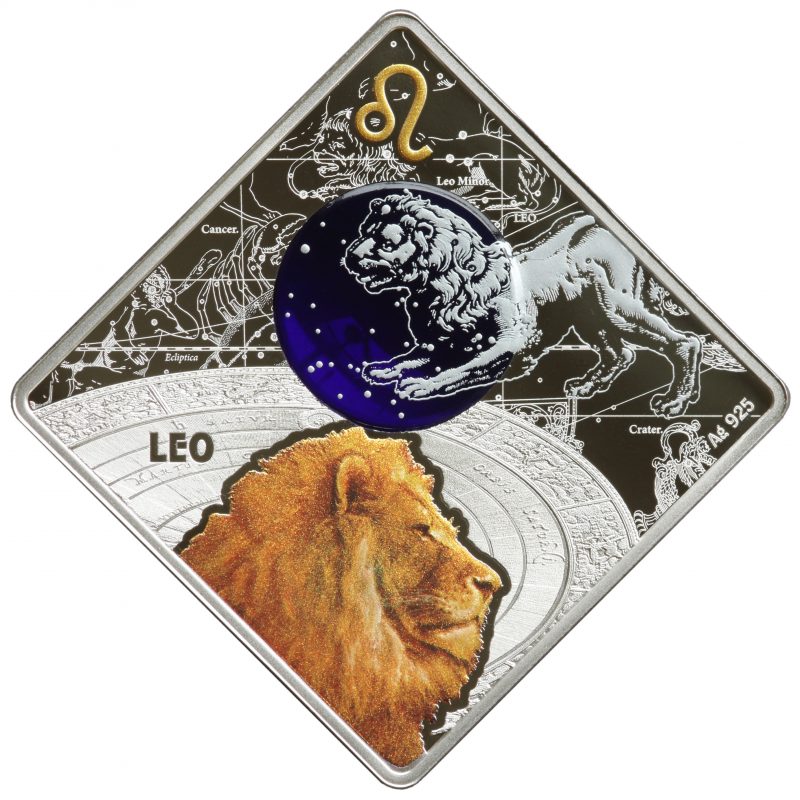 На реверсот, во горниот дел од монетата е претставена слика на лав од ѕвездениот атлас Firmamentum Sobiescianum, создаден од Јоханес Хевелиј на крајот на 17 век. Сликата на хороскопскиот знак лав и неговото соѕвездие преминува и на вметнатото кобалтно стакленце. Во горниот дел од монетата е претставен симболот на хороскопскиот знак лав. Во долниот дел е претставена златна слика на лав, врз цртеж на кој е претставен Сончевиот Систем. На левата страна е прикажано латинското име на хороскопскиот знак – LEO, а на десната страна, ознаката Ag925. Овие ковани пари се изработени од сребро Ag925, со тежина на среброто од 23,30 г, чистота на среброто од 19,43 г, во квадратна форма со димензии 37 х 37 мм, полирани со позлата и вметнато кобалтно стакленце со димензии 18,4 х 6,1 мм.