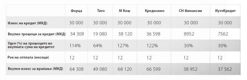 Во анонимното истражување беа обезбедени договори за кредит кои вклучуваат амортизациски планови и општи услови. Крајната анализа покажува дека само едно друштво (Иутекредит) работи со најмали трошоци кои не вклучуваат т.н. скриени или дополнителни трошоци и казни за неисполнување на условите за гаранција на кредитобарателите.