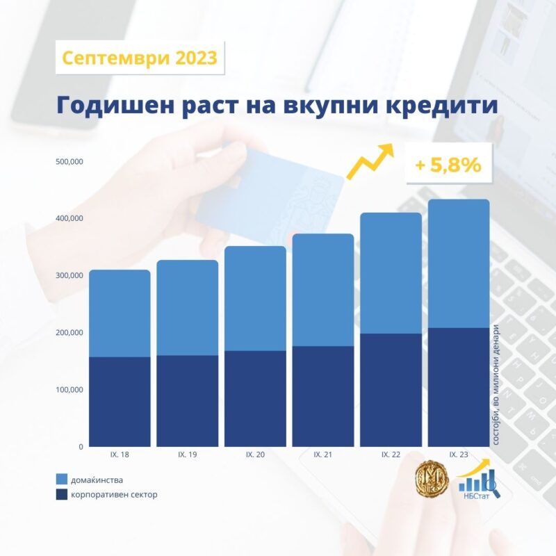 Годишниот пораст на кредитите од 5,8 % произлегува од повисокото кредитирање на двата сектора, при поизразен придонес на секторот домаќинства, велат од НБ.