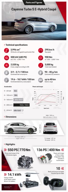 „Порше“ продолжува да се фокусира на електро-мобилноста, со новиот Cayenne, кој сега нуди и хибриден погон, како и својот претходник. Cayenne Turbo S E-Hybrid и Cayenne Turbo S E-Hybrid Coupé ја нудат моќта од 500 kW (680 КС), преку интелигентната интеракција на четирилитарскиот V8 мотор (404 kW / 550 КС) и интегриран електричен мотор со осумстепениот менувач Tiptronic S (100 kW / 136 КС). Максималниот вртежен момент на системот од 900 Nm е достапен при најмало притискање на педалот за гас. Двата модела забрзуваат од 0 до 100 км на час за 3,8 секунди и достигнуваат максимална брзина од 295 км на час. Оваа исклучителна изведба се совпаѓа со високото ниво на ефикасност: Cayenne Turbo S E-Hybrid и Turbo S E-Hybrid Coupé можат да возат до 40 километри на само електричен погон.