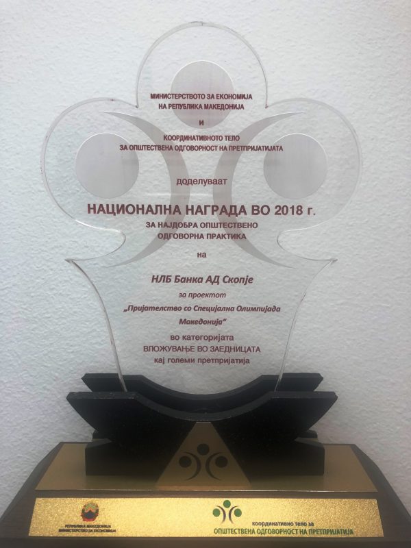 НЛБ Банка АД Скопје е добитник на Националната награда за најдобри општествено одговорни практики за 2018 година, во категоријата вложување во заедницата со проектот „Пријателство со Специјална олимпијада Македонија“.