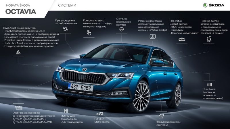 Уште подобра, попросторна, поемотивна и со подобра поврзаност од било кога, со претставувањето на четвратата генерација на својот бестселер, ŠKODA достигнува нова димензија. Срцето на брендот ŠKODA, новата Octavia е подолга и поширока од својата претходна генерација, има уште поголем багажен простор и е со поемотивен дизајн благодарение на дизајнерскиот јазик на ŠKODA. Дополнително, со новата Octavia, ŠKODA воведува и нов дизајнерски концепт за ентериерот кој комбинира одлична просторна понуда со високо-квалитетни материјали, неверојатна функционалност и милион паметни детали. Иновативната поврзаност и новиот систем за асистенција го подигнуваат комфорот и безбедноста на многу повисоко ниво.