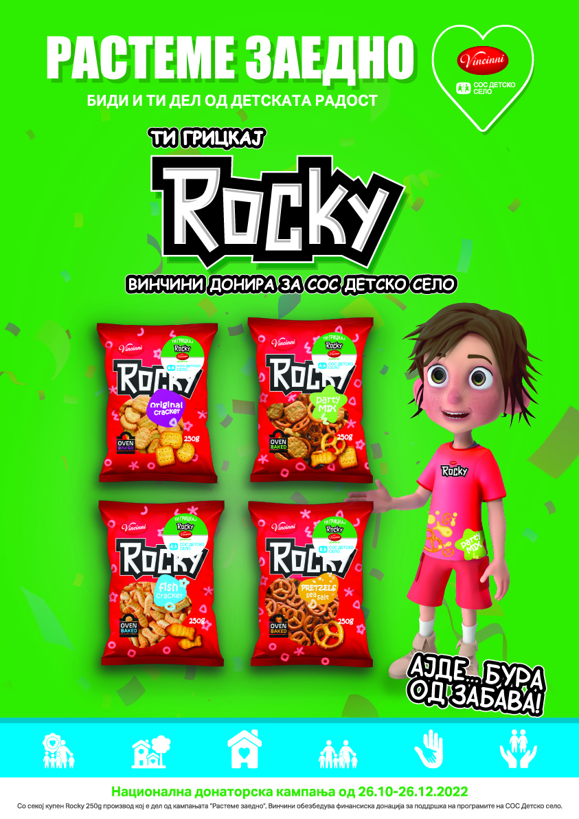 Ги повикуваме сите потрошувачи да бидат дел од оваа кампања и заеднички да ја поддржиме мисијата на СОС Детско село – топол дом и грижа за секое дете, и да растеме заедно со палетата на производи на ROCKY.