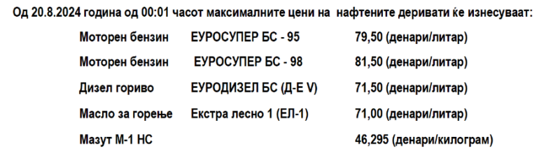 „Напоменуваме дека ова се максималните цени на нафтените деривати од 00:01 часот на 20.8.2024 година. Трговците на големо и трговците на мало со нафтени деривати и горива за транспорт можат да ги формираат цените на одделни нафтени деривати и горива за транспорт и пониско од највисоките утврдени цени“, велат од РКЕ.