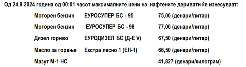 Малопродажните цени на бензините ЕУРОСУПЕР БС-95 и ЕУРОСУПЕР БС-98 се зголемуваат за 1,50 ден/лит, додека малопродажните цени на ЕУРОДИЗЕЛ (Д-Е V) и на Екстра лесното масло за домаќинство на (ЕЛ-1) се зголемуваат за 0,50 ден/лит.
