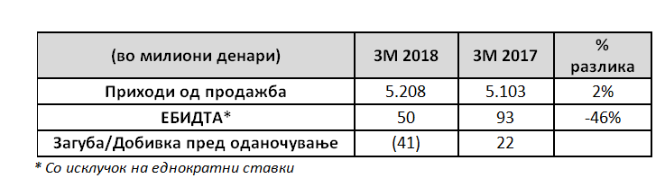 „Окта“ АД Скопје го заврши првиот квартал од 2018 година со приходи од продажба во износ од 5.208 милиони денари во споредба со 5.103 милиони денари од истиот период минатата година како резултат на повисоките интернационални цени на горивото. Продажните количини на домашниот и на странскиот пазар се одвиваа со стабилен тек, што придонесе кон соодветно зацврстување како на домашниот така и на странскиот пазарен удел. Приспособената ЕБИДТА изнесува 50 милиони денари во споредба со 93 милиони денари во првиот квартал од 2017 година главно поради пониските маржи што произлегоа од повисоките дисконти остварени како резултат на промените во структурата на плаќање. Загубата пред даночењето во првиот квартал од 2018 година изнесува 41 милион денари во споредба со добивката пред даночење од 22 милиона денари за истиот период минатата година поради веќе споменатите причини елаборирани претходно во текстот.