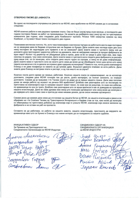 Вработените во „Фени индустри“, револтирани од наводите на „Транспаресни интернешнл – Македонија“, испратија отворено писмо со цел изворно да ја информираат јавноста за случувањата во комбинатот. Писмото го потпишале иницијативниот одбор за промена на претседател на Синдикатот и синдикалниот одбор на фабриката.