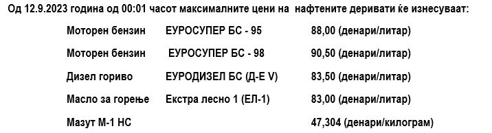 Малопродажните цени на бензините „евросупер БС-95“ и „евросупер БС-98“ се зголемуваат 1,00 денар/л, а малопродажните цени на „евродизелот (Д-Е V)“ и на екстра-лесното масло за домаќинство (ЕЛ-1) се зголемуваат 2,50 денари/л.