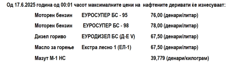 „Напоменуваме дека ова се максималните цени на нафтените деривати од 00:01 часот на 17.6.2025 година. Трговците на големо и трговците на мало со нафтени деривати и горива за транспорт можат да ги формираат цените на одделни нафтени деривати и горива за транспорт и пониско од највисоките утврдени цени“, велат од РКЕ.