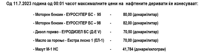 „Напоменуваме дека ова се максималните цени на нафтените деривати од 00.01 часот на 11.7.2023 година. Трговците на големо и трговците на мало со нафтени деривати и горива за транспорт може да ги формираат цените на одделни нафтени деривати и горива за транспорт и пониско од највисоките утврдени цени“, се додава во соопштението на РКЕ.