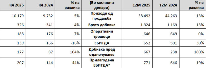 Добивката пред оданочување во фискалната 2025 година значително се зголеми на 667 милиони денари, во споредба со 238 милиони денари во 2024 година. Покрај подобрените оперативни остварувања, резултатот е одраз и на помала амортизација по еднократната забрзана амортизација во 2024 година, предвидениот поврат на Данокот на солидарност од 50 милиони денари платен во 2023 година и оптимизирано управување со готовината. Во четвртиот квартал од 2025 година, добивката пред оданочување изнесуваше 177 милиони денари во споредба со 87 милиони денари во четвртиот квартал од 2024 година.