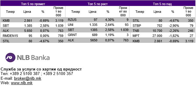 Се тргуваше со 12 хартии од вредност при што бројот на добитници/губитници е изедначен, додека без промена на вредноста се тргуваа две хартии од вредност. Вкупниот промет изнесуваше 6,6 милиони денари, а се реализираа 32 трансакции.