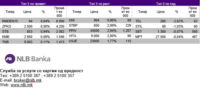Според процентот на пораст на просечната цена, најатрактивни за инвеститорите беа акциите на Уни банка. каде со 80 истргувани лотови цената порасна за 9,96 отсто и моментално изнесува 994 денари.