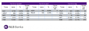Листата на добитници беше многу скромна со само две акциии и тоа Адинг Скопје со раст од 9,55 отсто со истргувани 5 акции по просечна цена од 700 денари и РЖ Услуги со раст од 2,04 проценти и истргувани 12 акции по просечна цена од 100 денари.