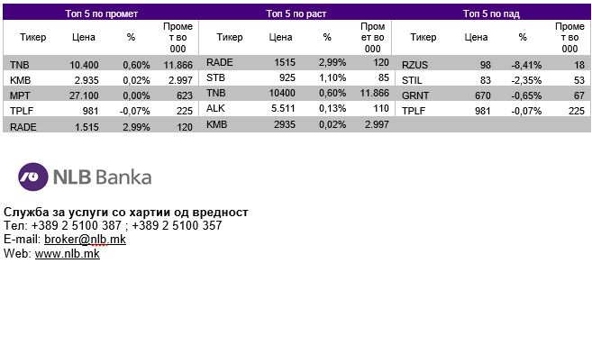 Со оваа хартија од вредност беше остварен промет од 11,8 милиони денари и истргувани 1.141 лотови по цена од 10.400 денари. при што цената порасана за 0,60 отсто.