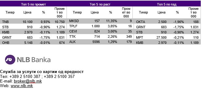 Акцијата на НЛБ банка на врвот по прометот на Македонска берза