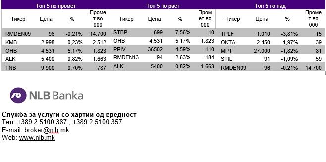 Трговскиот ден заврши со вкупен промет од 53,3 милиони денари, и вкупно 96 реализирани трансакции.
