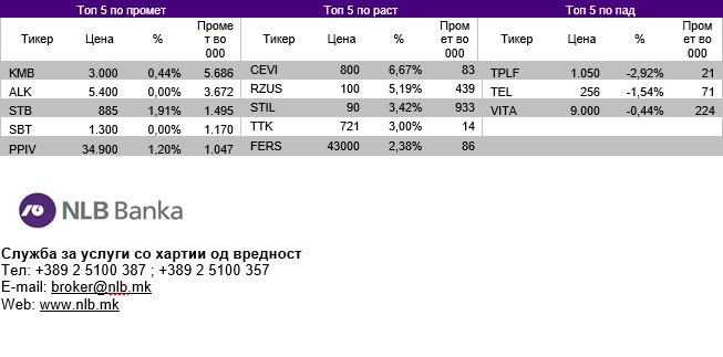 Во текот на денот се тргуваше со вкупно дваесет и две хартии од вредност, индексот МБИ-10 забележа раст од 0,31 отсто и заврши на вредност од 2.225,03 индексни поени.